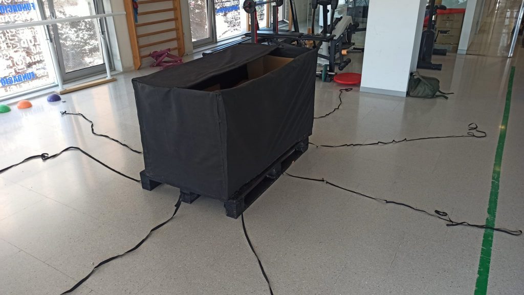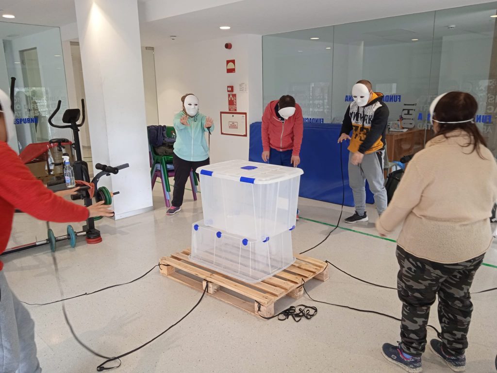 Dicho y hecho. Empezamos a trabajar en el proyecto y poco a poco fue cogiendo forma. Pensamos en que queríamos expresar las cargas emocionales que de manera individual cada uno lleva en «su mochila particular» y cómo a veces estas cargas nos atormentan y nos paralizan al sentirnos atados. Para simbolizar esto, usamos como metáfora una gran caja negra que presidiría el escenario y los actores estaríamos atados a ella mediante gomas negras. Nos despertaríamos de un letargo unidos a esa caja pesada y nos daríamos cuenta de que no podíamos escapar de ella. Iríamos con máscaras neutras que ocultarían nuestros rostros aludiendo a las máscaras que a veces nos ponemos para aparentar que no nos ocurre nada y que estamos bien.