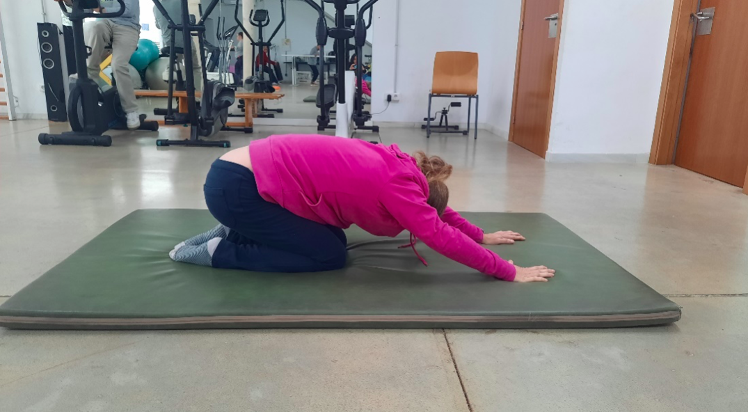 Empezamos el ejercicio en cuadrupedia, después llevamos los glúteos hacia los talones, realizando una flexión completa de la columna vertebral. Estiramos los brazos hacia adelante y mantenemos la posición 15 segundos. Este ejercicio es beneficioso para aumentar la movilidad en general y flexibilizar la columna.
