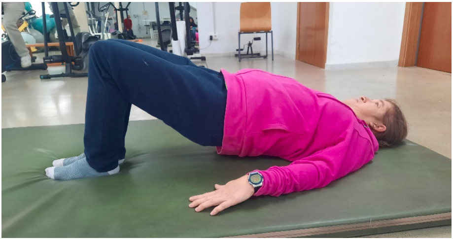 Con este ejercicio tonificamos la musculatura de miembros inferiores y abdomen. Al mismo tiempo, ayuda a aliviar dolores en la zona lumbar. Este ejercicio parte de la posición de decúbito supino, rodillas flexionadas y pies apoyados; manteniendo la pelvis en una posición neutra y la espalda recta. Una vez colocados en la posición correcta, se coge aire por la nariz y al soltarlo debemos centrarnos en contraer la musculatura abdominal y glútea. Seguidamente debemos hacer una retroversión de la pelvis, elevando la columna hasta quedar apoyada a la altura de las escápulas. Se vuelve a coger aire manteniendo la posición y al soltarlo, ir bajando la columna vértebra a vértebra hasta volver a la posición de partida.