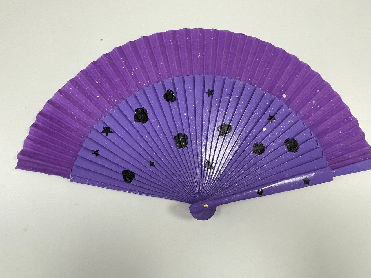 Abanico de madera y tela con diseño del cielo de noche pintado a mano en nuestro taller de artesanía.