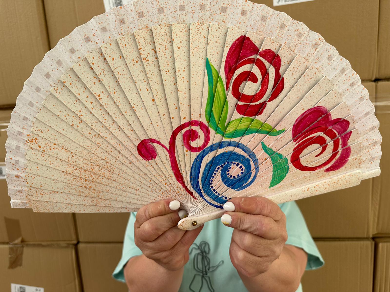 Abanicos de madera grande con diseño de flor «rosa», dibujado a mano en nuestros talleres de Fundació Espurna.