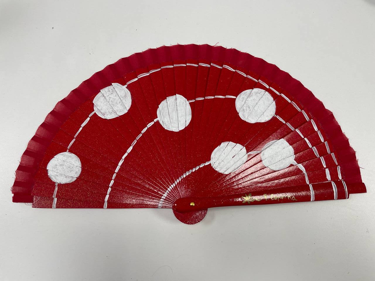 Abanico pequeño de madera pintado a mano con dibujos de lunares en nuestro taller de artesanía.