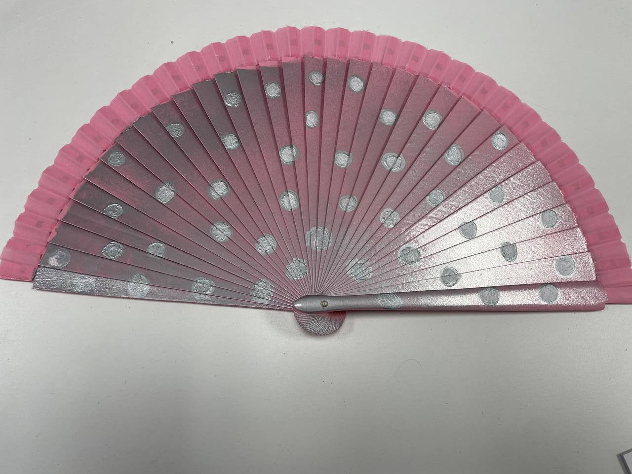 Abanico de madera y tela pintado con puntitos blancos a mano en nuestro taller de artesanía.