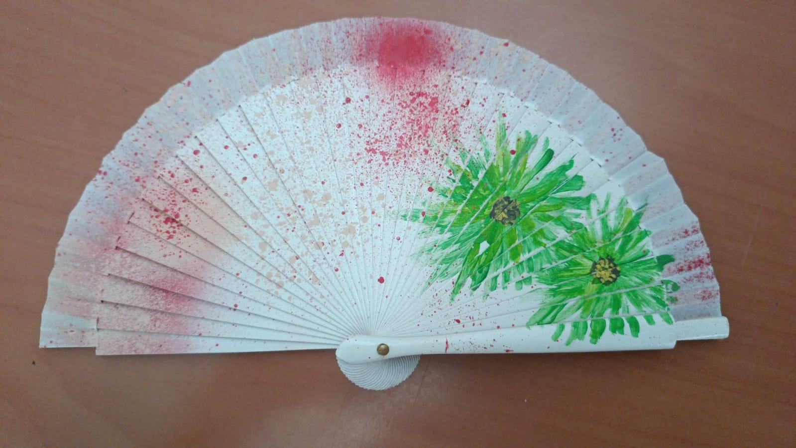Abanico de madera y tela pintado a mano en nuestro taller de artesanía.