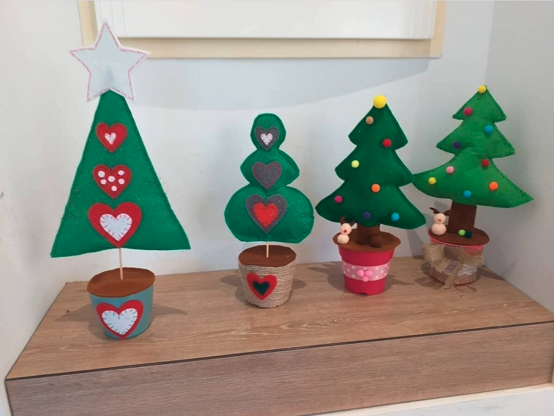 Maceta decorada con árbol de Navidad de fieltro, cosido a mano. Realizado en el taller de costura, ideal para decorar nuestras casas.