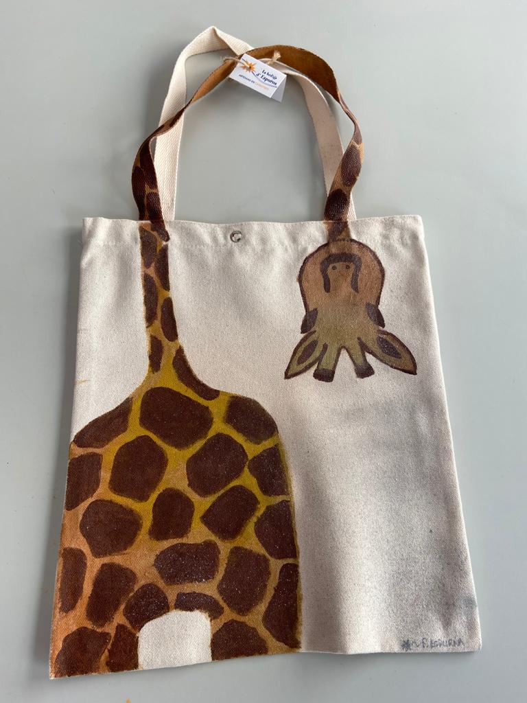 Bolso de tela pintado a mano en el taller de artesanía creativa de Fundació Espurna. En este diseño una jirafa con el cuello tan largo que sube por el asa del bolso.