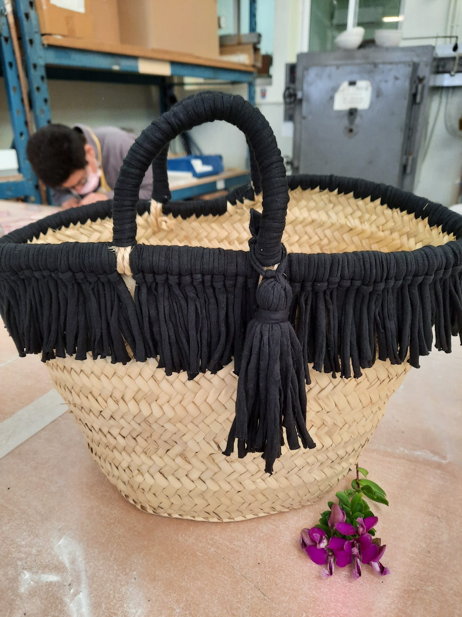 Capazo de mano decorado en nuestro taller de artesanía con flecos de tela.