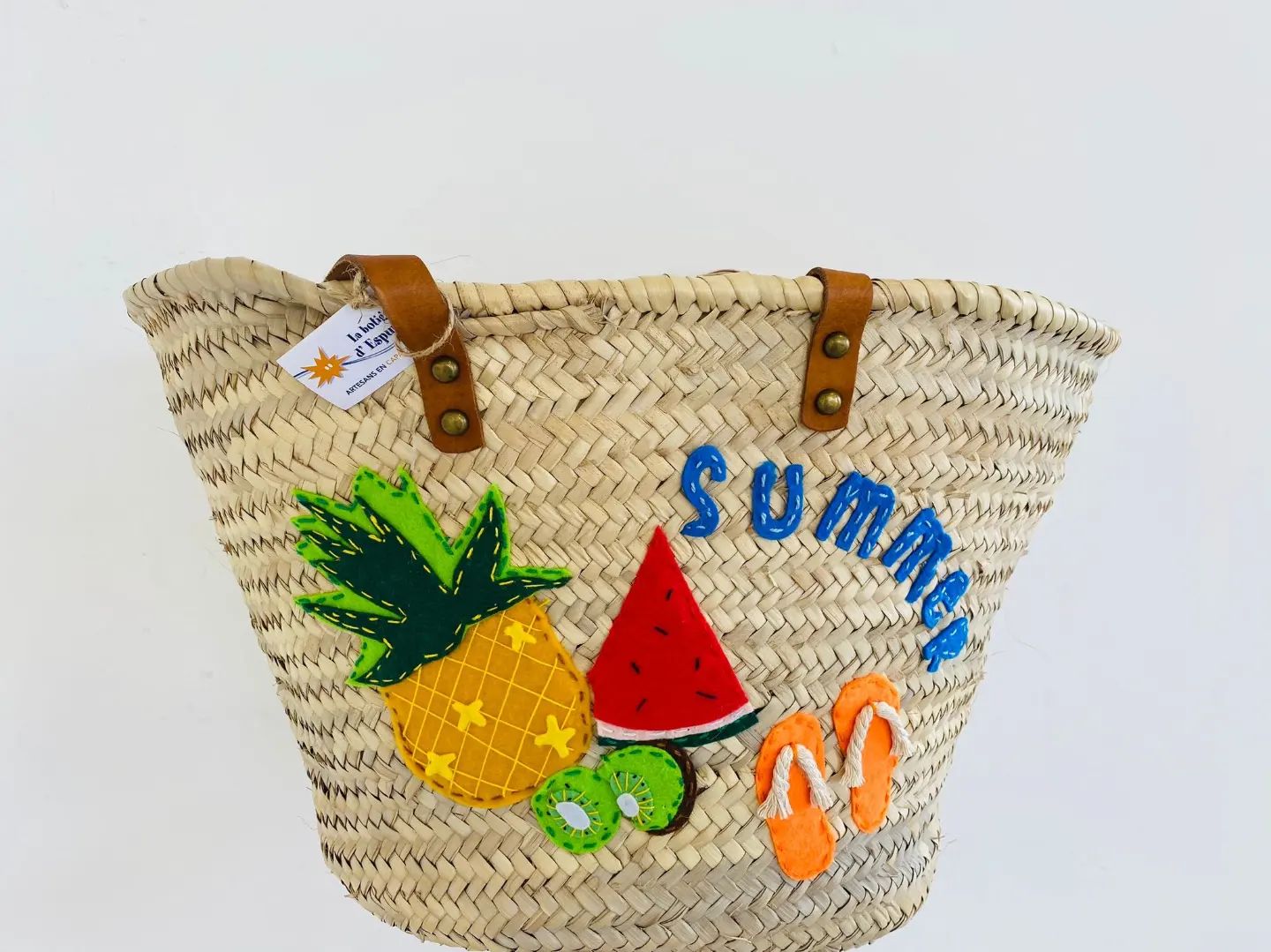 Capazo grande con asas, decorado a mano con dibujos con temática de verano en nuestro taller de artesanía.