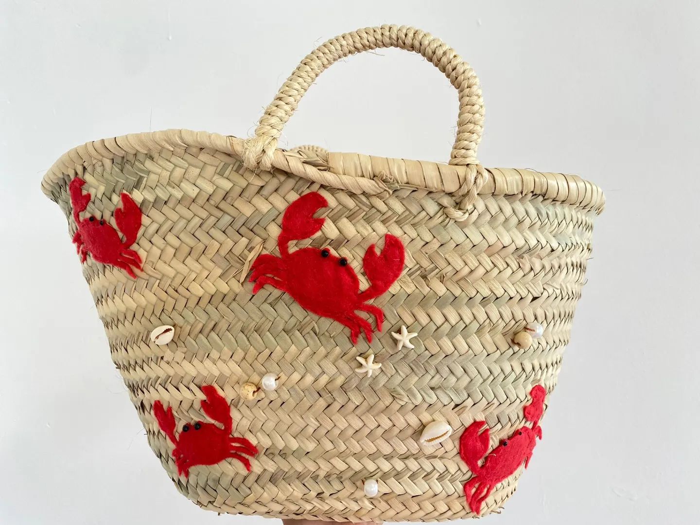 Capazo grande con asas, decorado con dibujos de cangrejos, hecho y decorado a mano en nuestro taller de artesanía