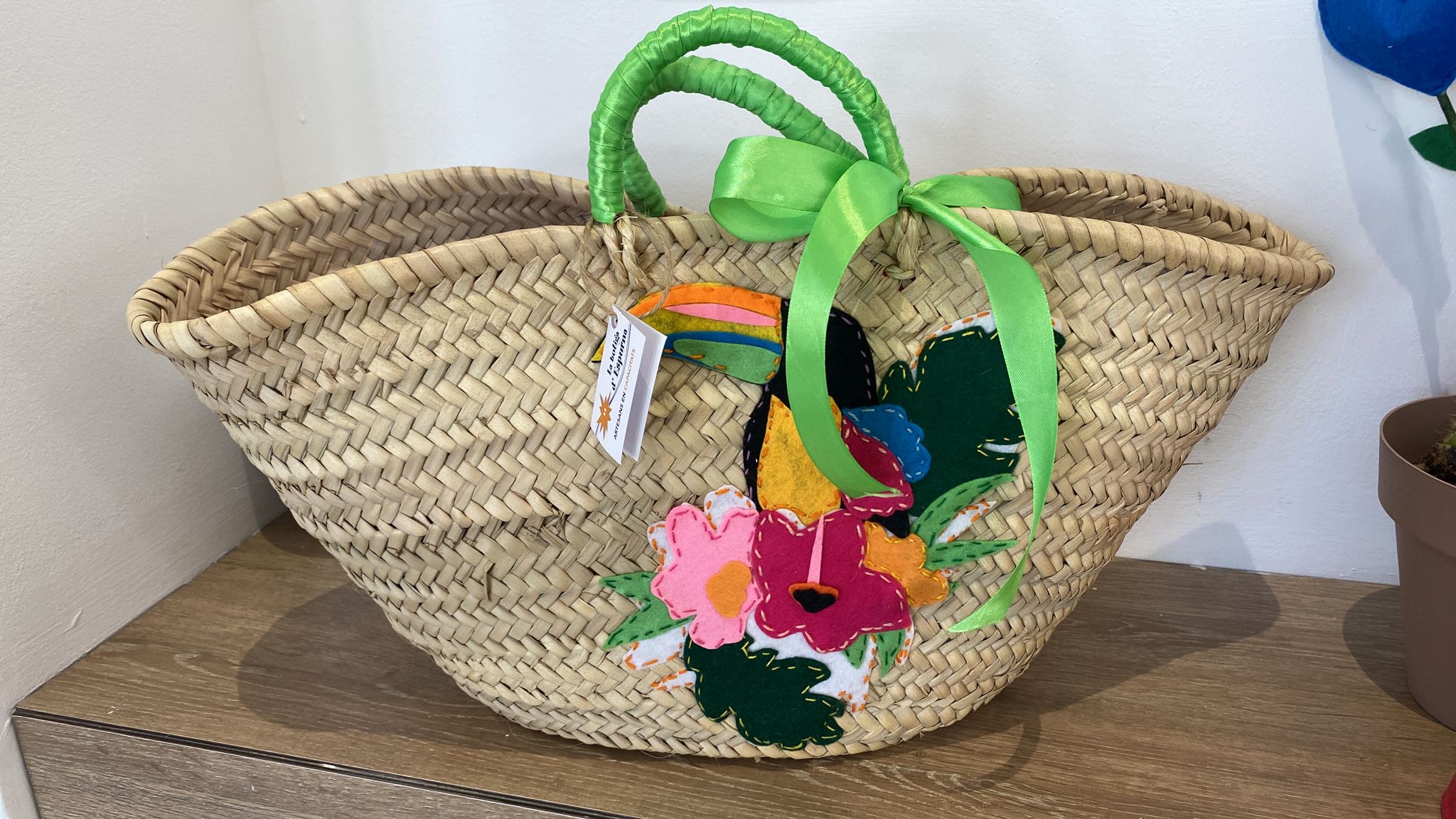 Capazo grande con asas, decorado con dibujo de un Tucán, hecho y decorado a mano en nuestro taller de artesanía