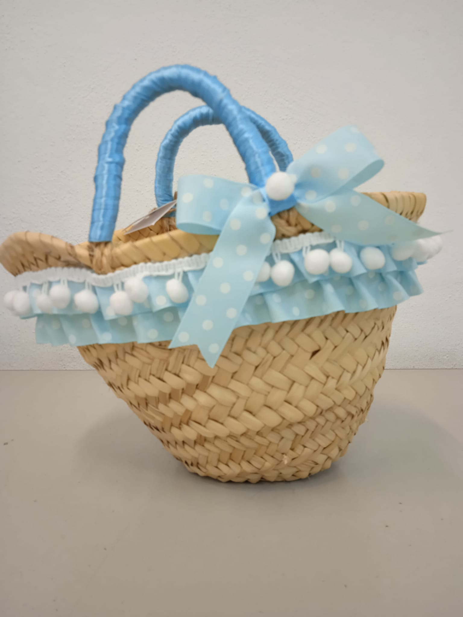 Capazo infantil con borlitas y asas forradas sin cierre.