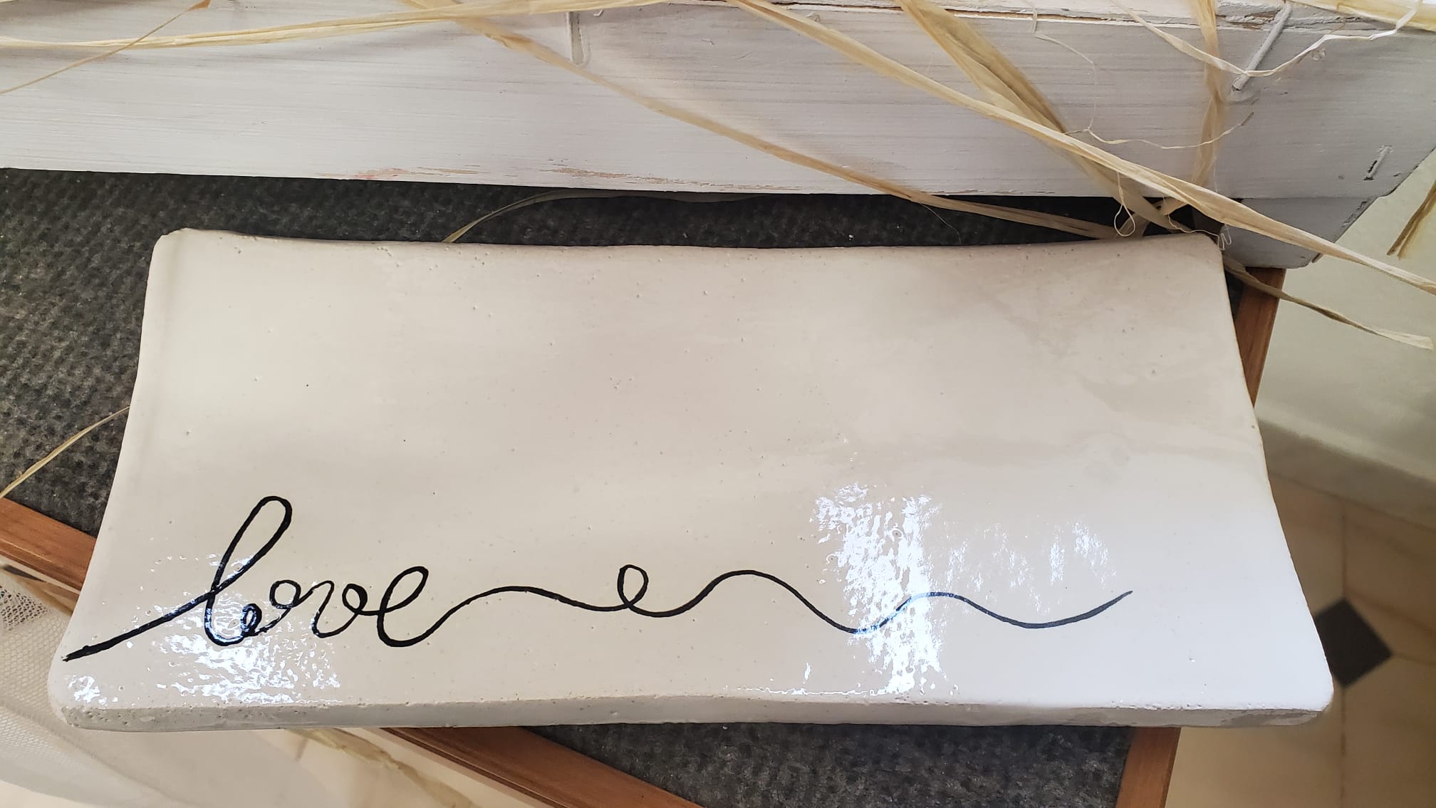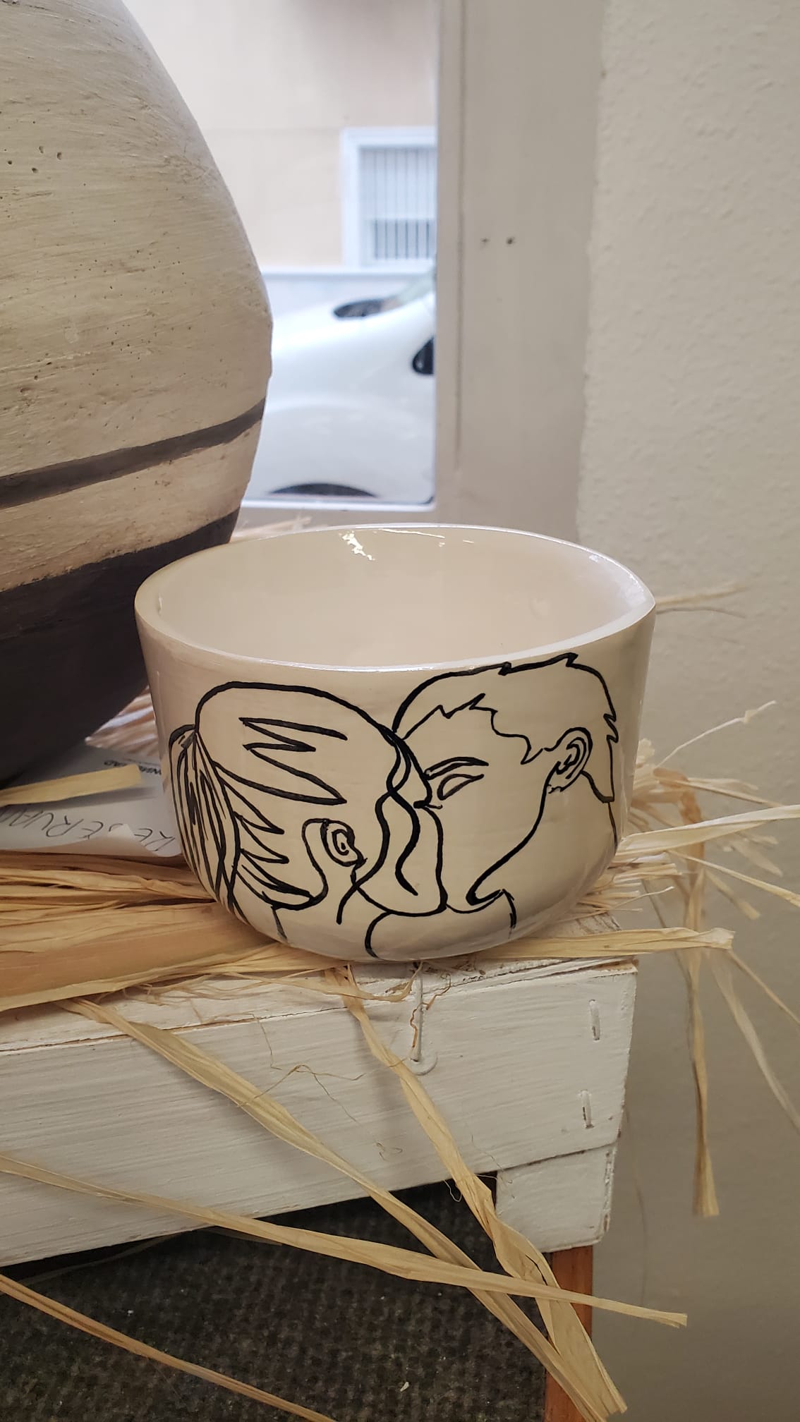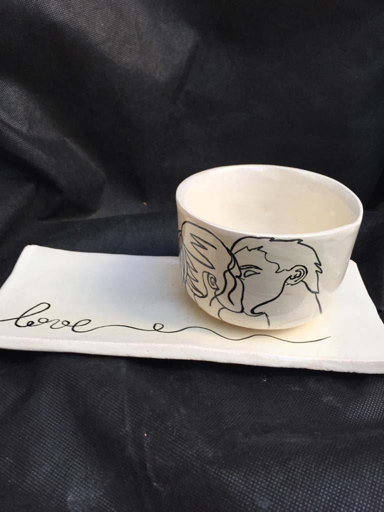 Conjunto de taza con plato alargado de cerámica, hecho y pintado a mano.