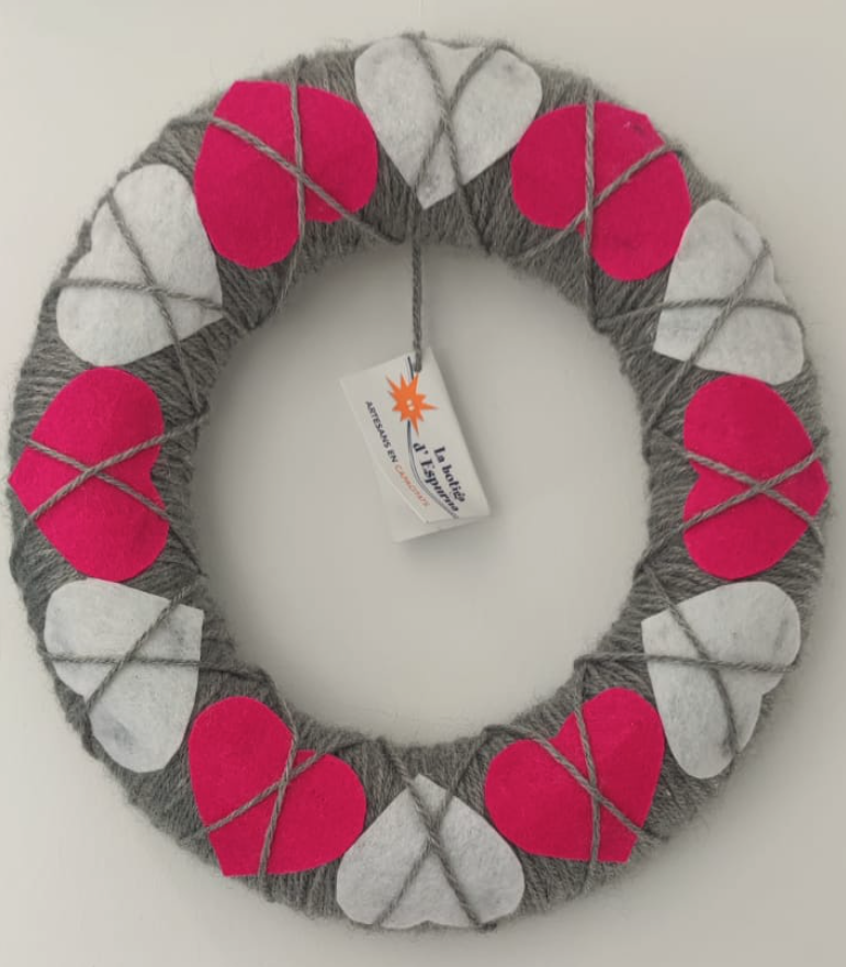 Corona de corcho, decorada con lana gris y corazones de fieltro. Realizada en el taller de creatividad, ideal para decorar nuestras puertas estas navidades.