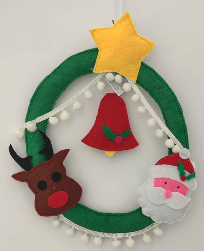 Corona navideña decorada de fieltro cosida a mano, con tres motivos ( reno, papa Noel y estrella). Realizada en el taller de costura, ideal para decorar nuestras puertas.