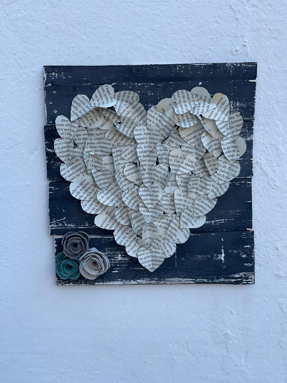 Cuadro decorativo de madera reciclada pintada a mano, con un gran corazón que se compone de muchos pequeños corazones de papel.