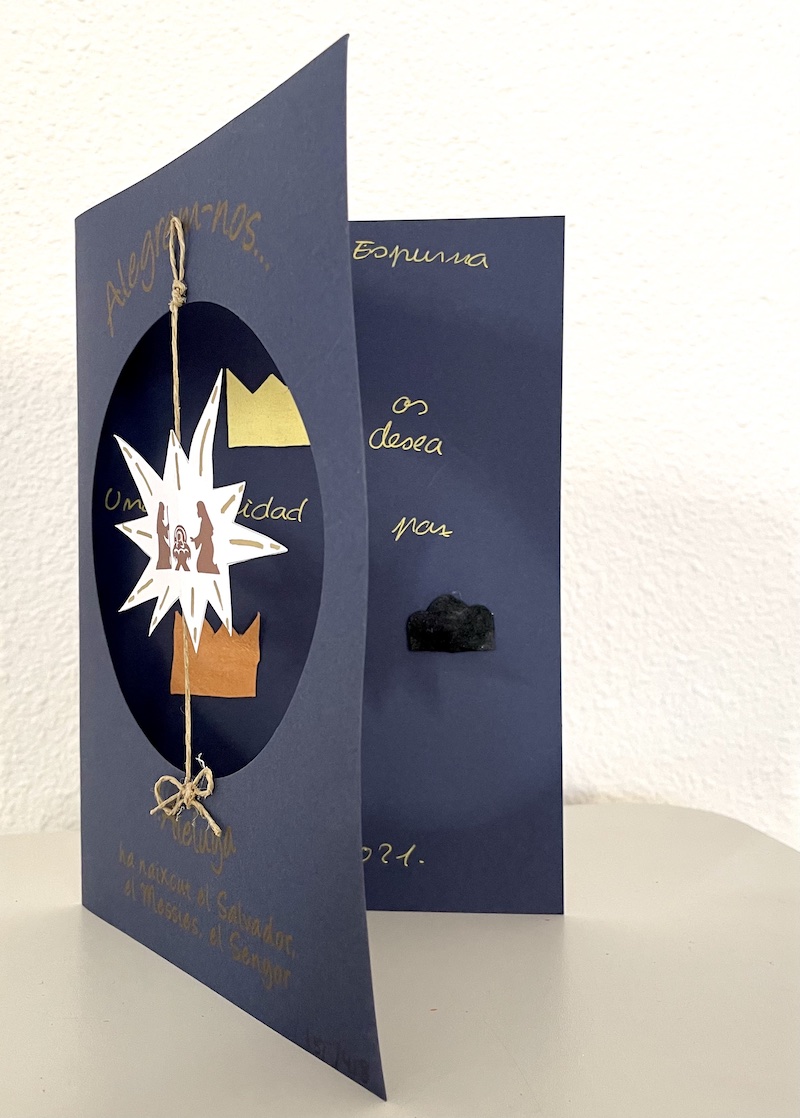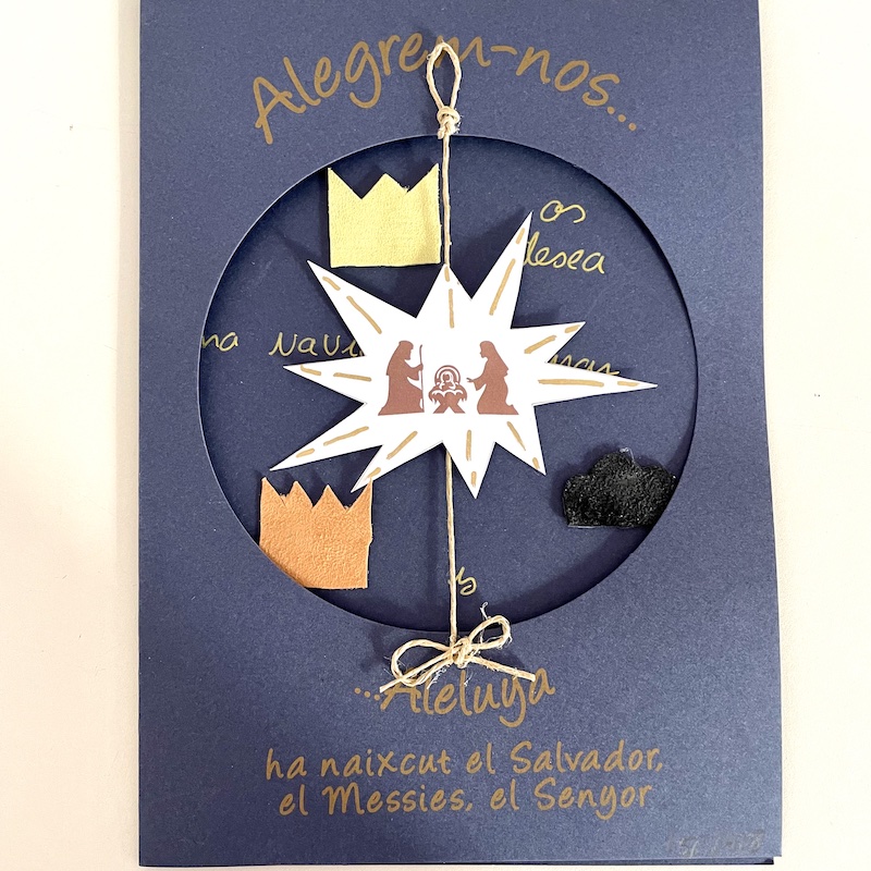 Felicitación de navidad con nacimiento sujetado en un cordón y las coronas de los reyes magos en el interior.