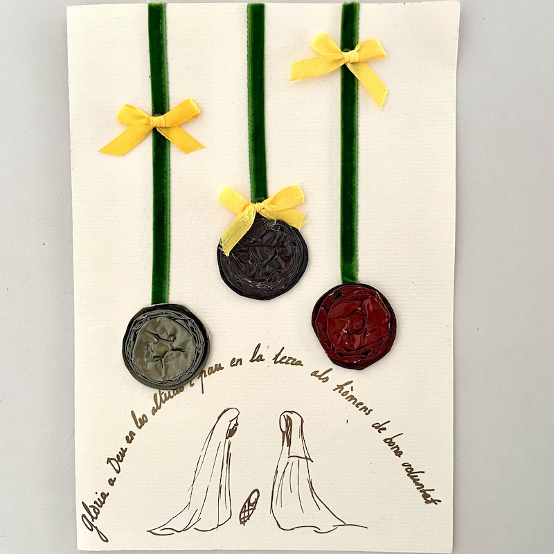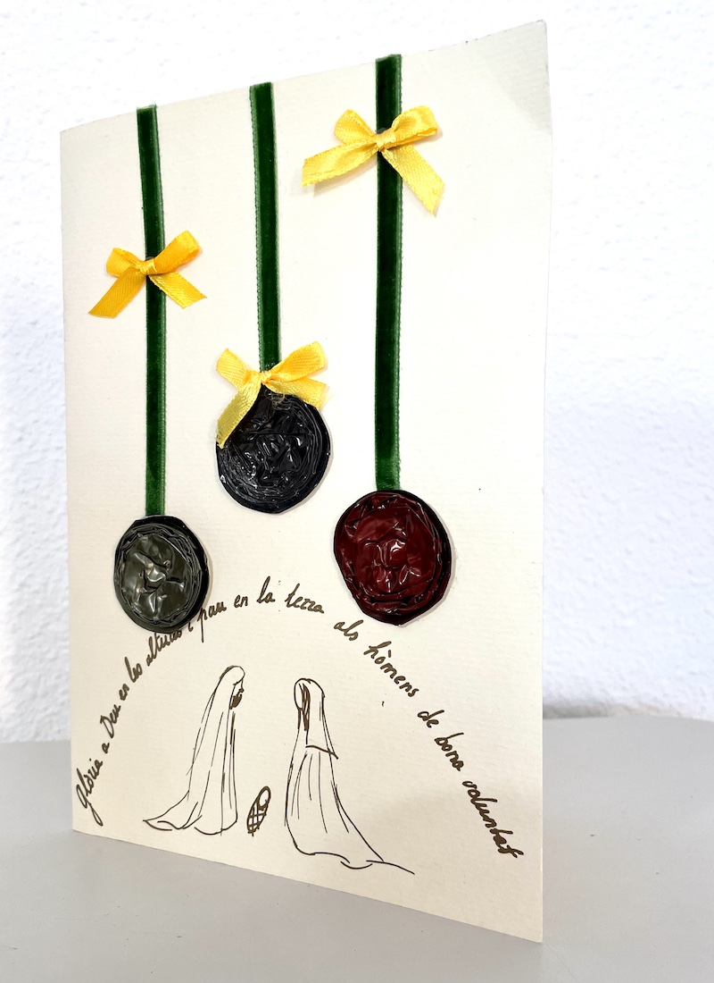 Felicitación de navidad con nacimiento decorada con cápsulas de café y lacitos.