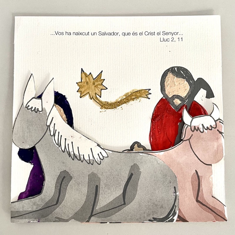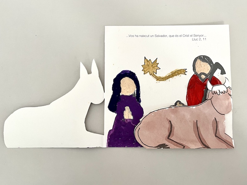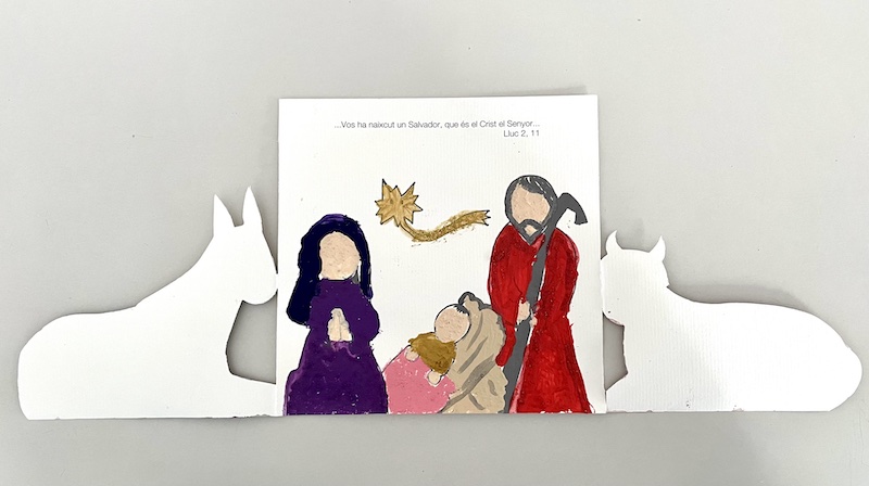 Felicitación de navidad con nacimiento sujetado en un cordón y las coronas de los reyes magos en el interior.