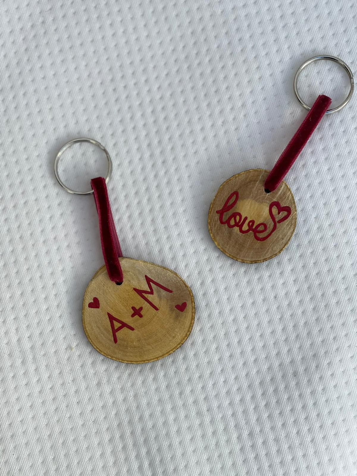 Comparte con tu San Valentín esta pareja de llaveros creados con tronco de madera y pintados a mano. La cinta es de terciopelo granate.
