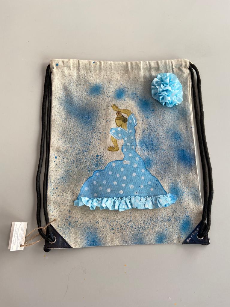 Mochila de tela pintadas a mano en el taller de artesanía creativa de Fundació Espurna. En este diseño la flamenca baila con su vestido de lunares azul y la flor y la puntilla de su falda están cosidas en relieve. La mochila tiene las esquinas inferiores reforzadas para mayor durabiliad.