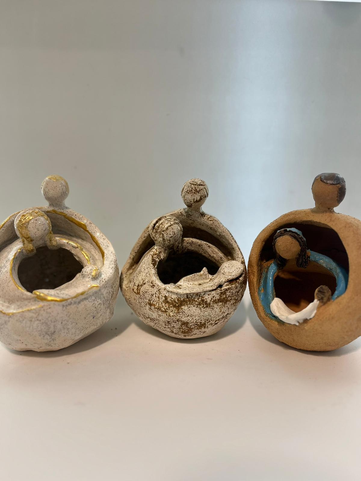 Nacimiento de cerámica. Cada figura está abrazada dentro de los brazos de la otra.