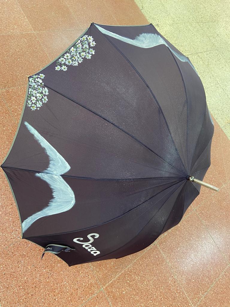 Paraguas pintado a mano y con spray en el taller creativo de Fundació Espurna. Además este modelo lleva tu nombre pintado, personalizamos todos nuestros diseños.