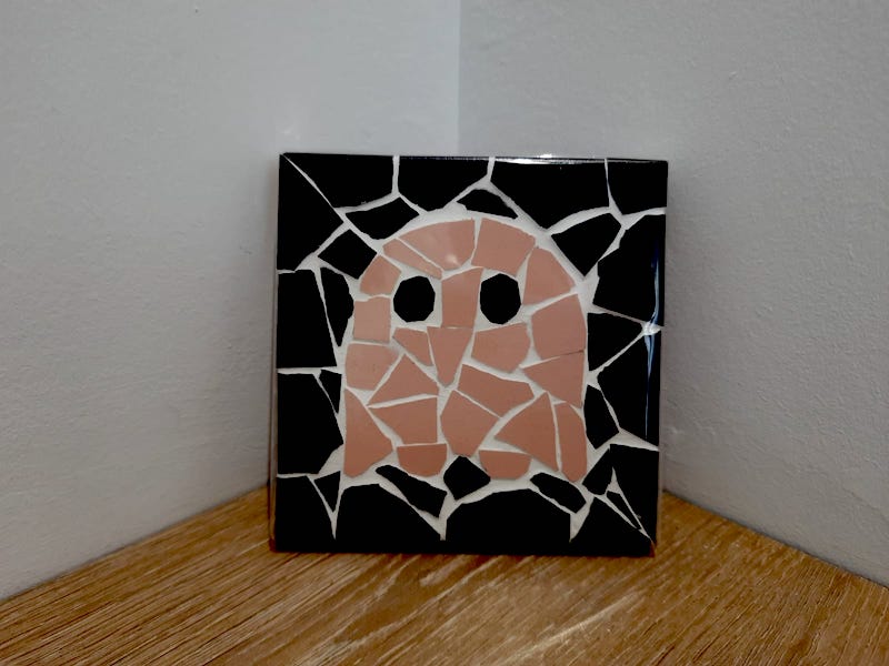 Posacafetera decorativa de trencadís con motivo de comecoco de color rosa, con fondo negro. Sobre base de corcho.