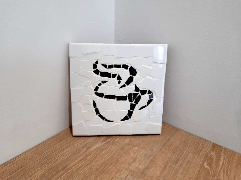 Posacafetera con motivo de taza de café de trencadís, en fondo blanco, sobre base de corcho.