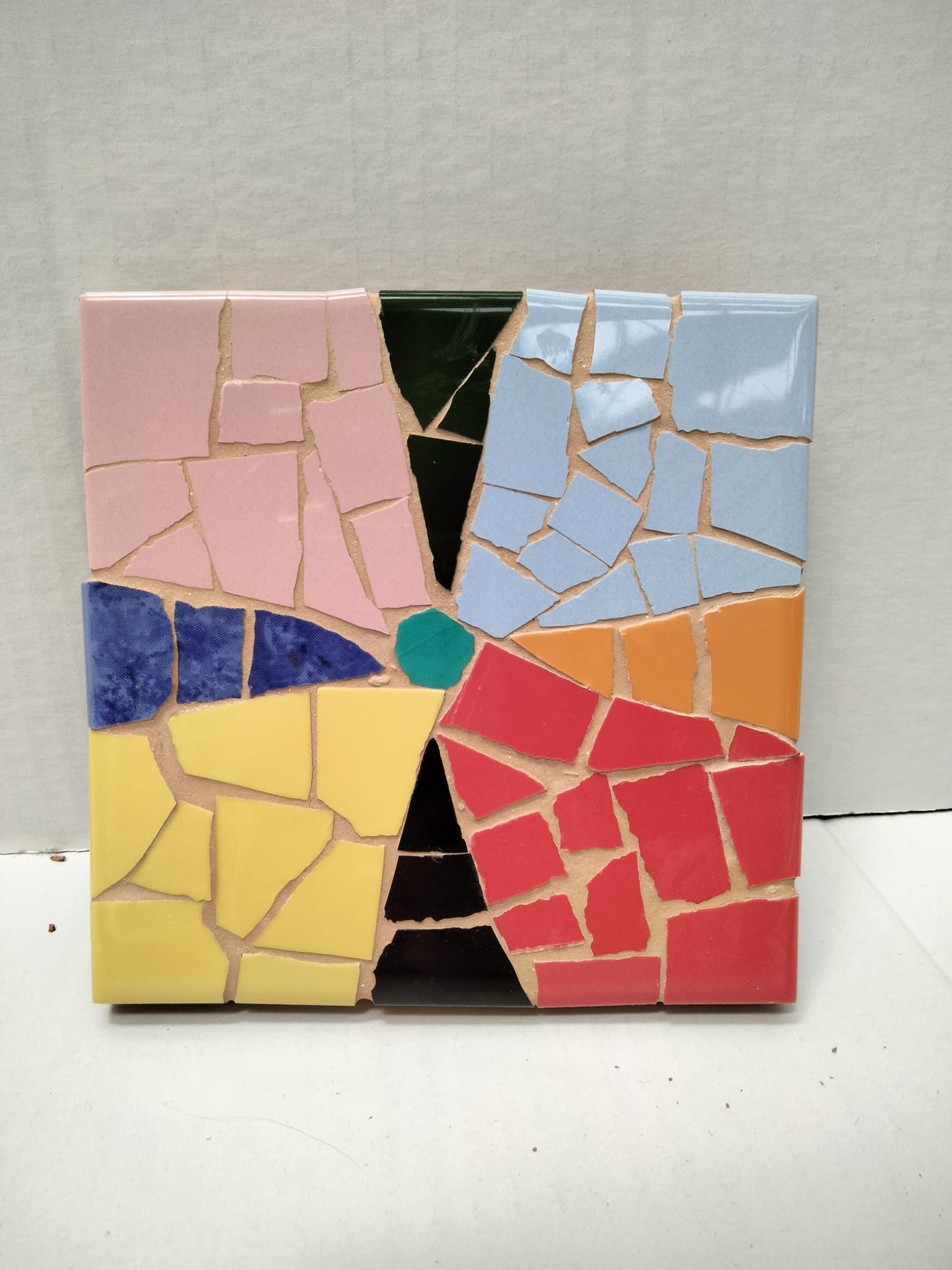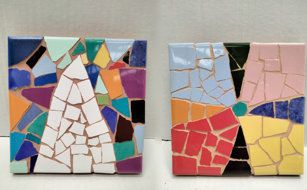 Menaje de trencadís con dibujos abstractos, donde podéis elegir entre los 2 diferentes diseños. Hecho a mano en nuestros talleres por los usuarios.