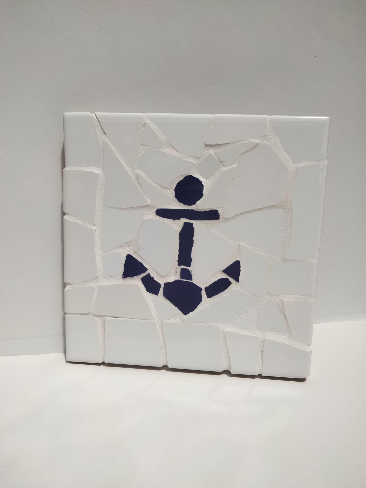 Menaje de trencadís con dibujo de ancla. Hecho a mano en nuestros talleres por los usuarios.