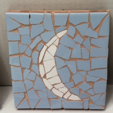 Menaje de trencadís con dibujo de luna en el centro. Hecho a mano en nuestros talleres por los usuarios.