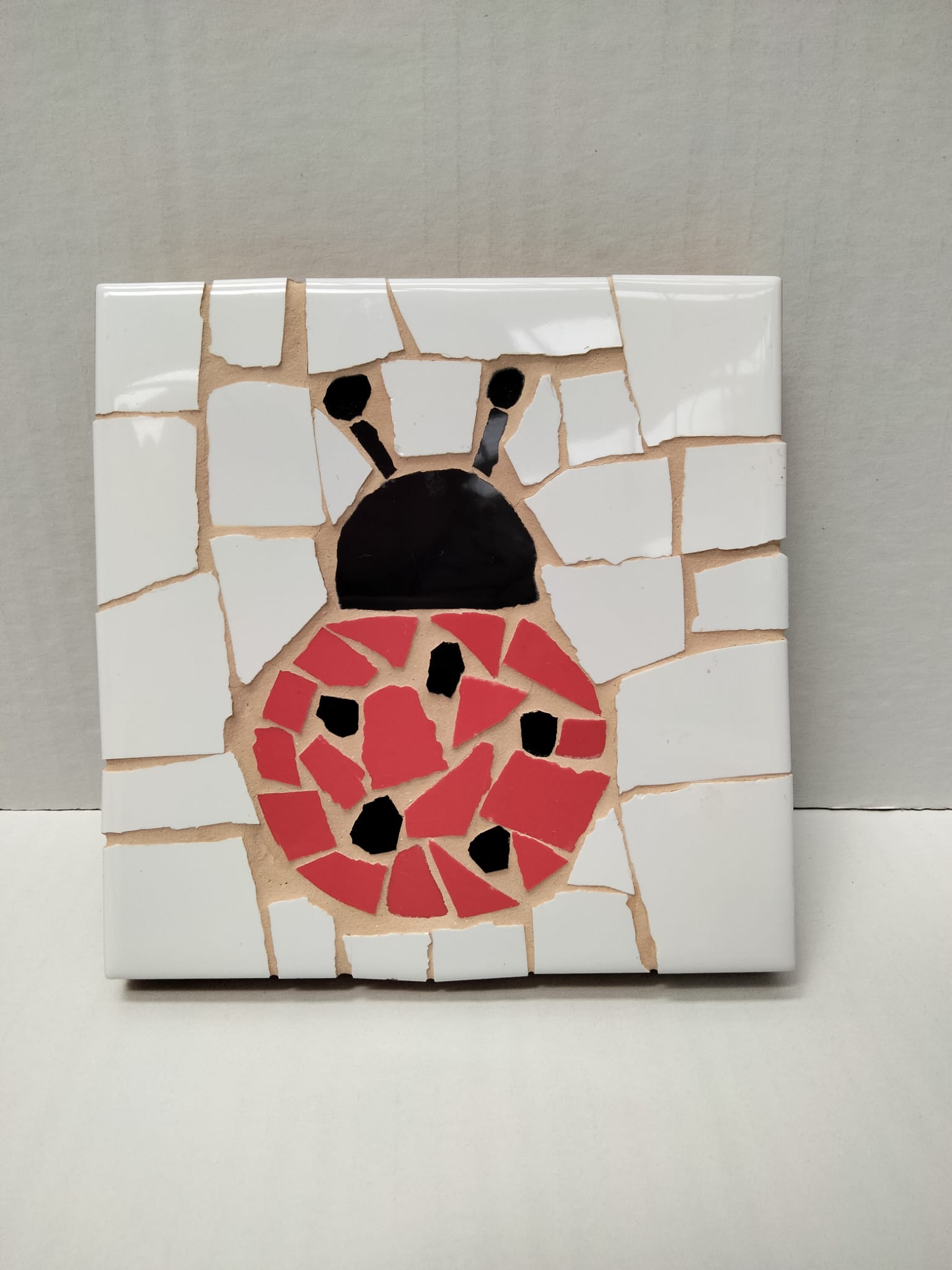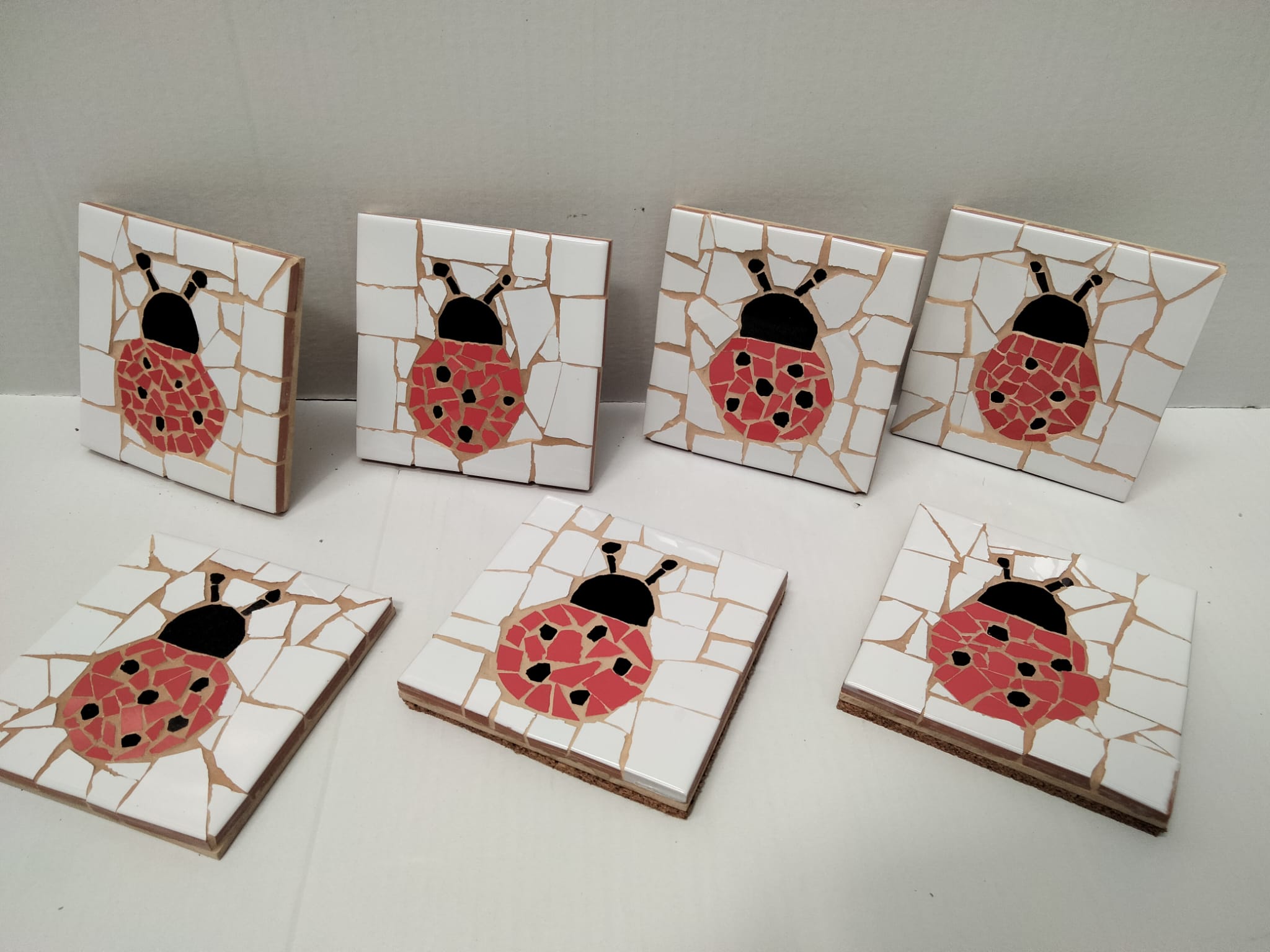 Menaje de trencadís con dibujos de mariquitas. Hecho a mano en nuestros talleres por los usuarios.