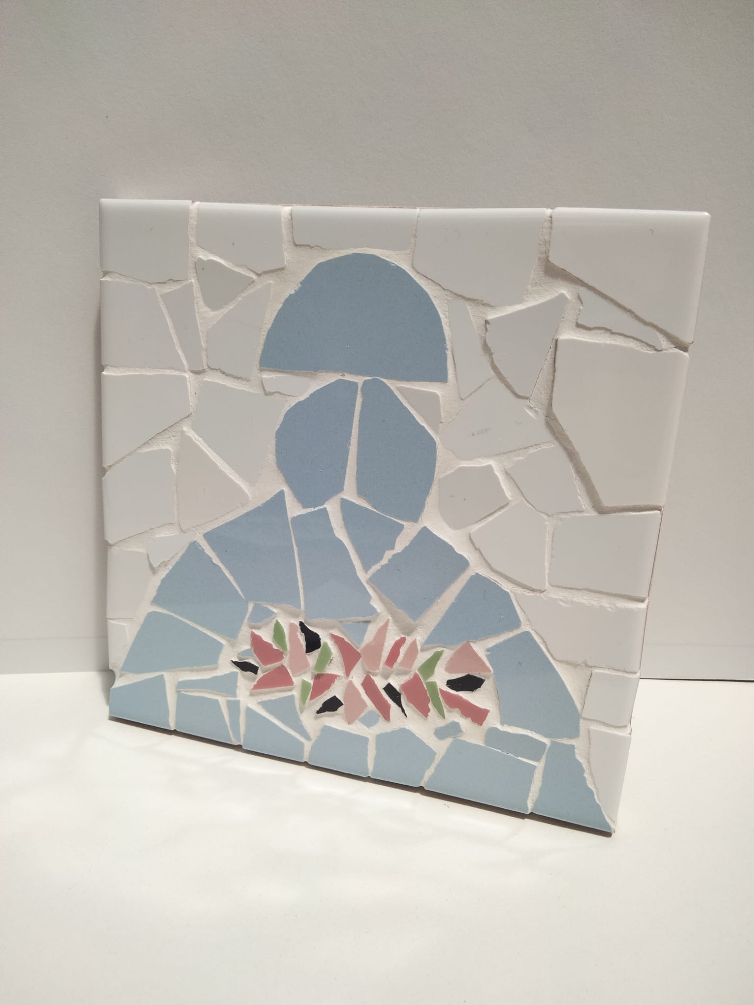 Menaje de trencadís con dibujo de menina. Hecho a mano en nuestros talleres por los usuarios.