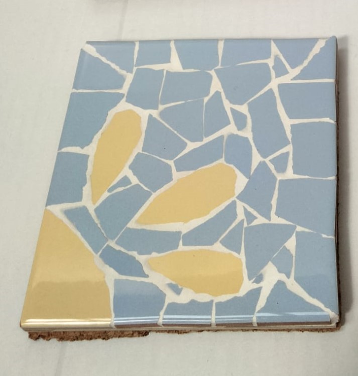 Menaje de trencadís con dibujo del sol en una esquina . Hecho a mano en nuestros talleres por los usuarios.
