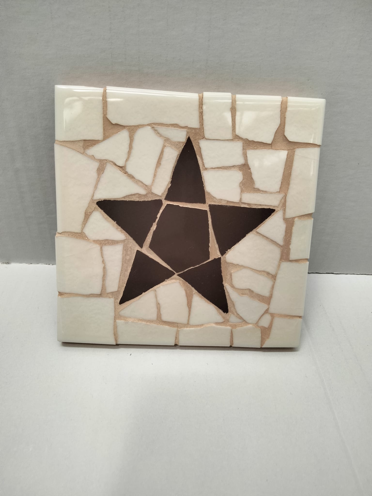 Menaje de trencadís con dibujo de estrella. Hecho a mano en nuestros talleres por los usuarios.