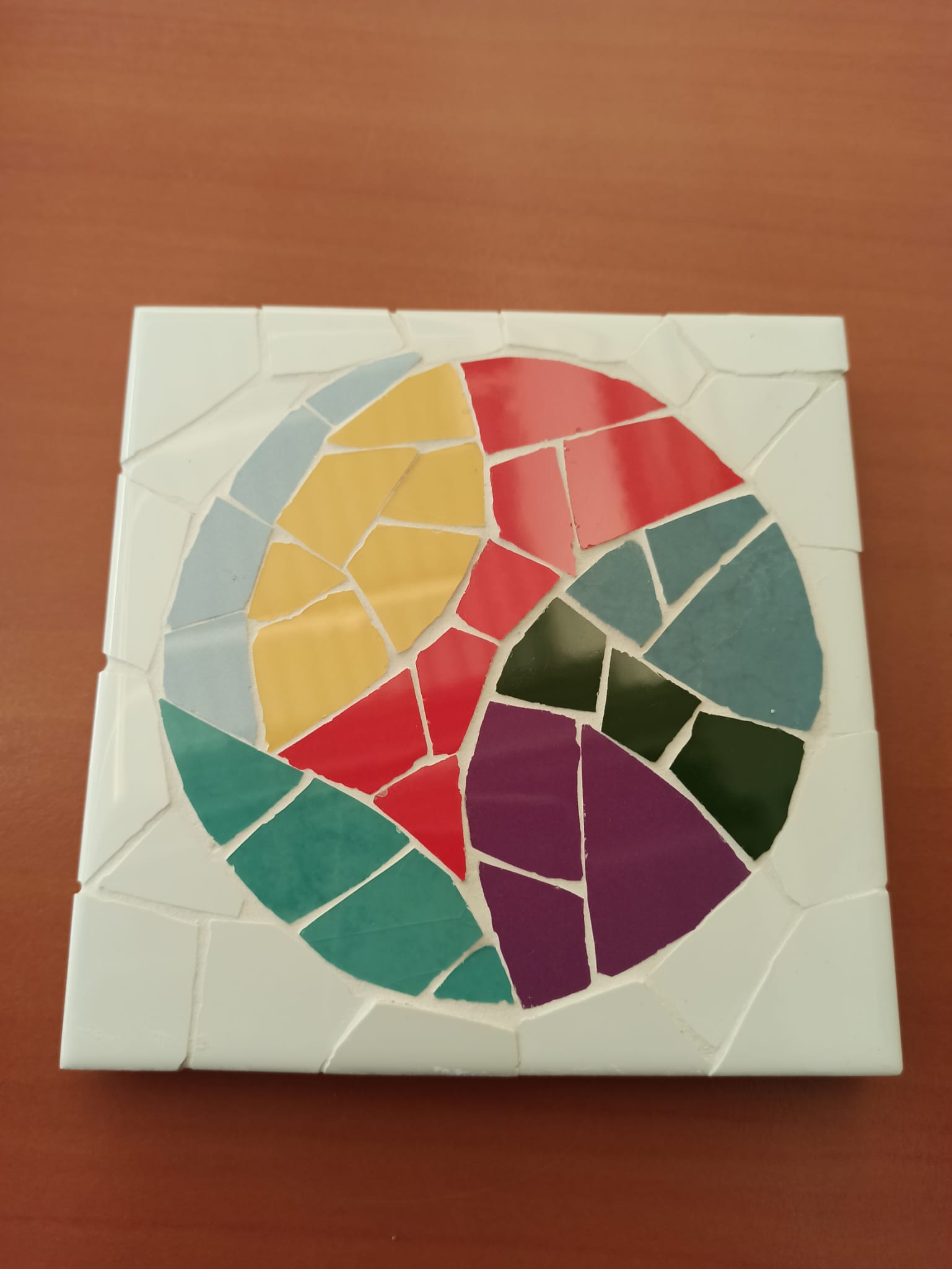 Posavasos de trencadís artesanal. Con motivo de balón multicolor. Hecho en madera, azulejo cerámico, masa mortero de rejuntado y corcho.