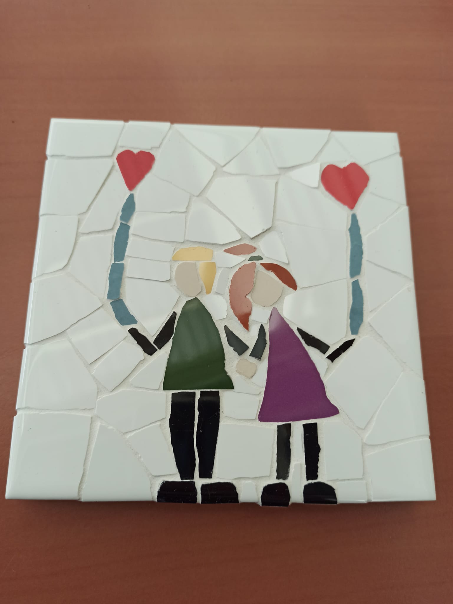 Posavasos de trencadís artesanal. Con motivo de enamorados y globos. Hecho en madera, azulejo cerámico, masa mortero de rejuntado y corcho.