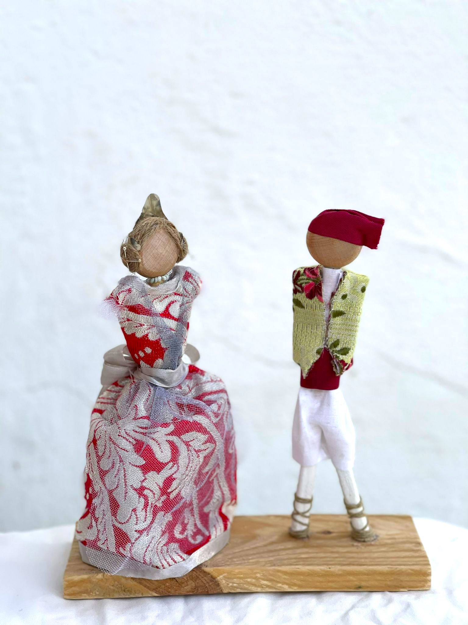 Motivo decorativo inspirado en las fallas, con una fallero y una fallera vestidos con los trajes tradicionales de valenciana. Montado con maderas recicladas y retales de tela fallera.