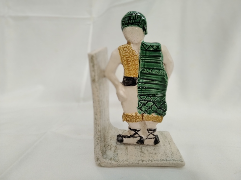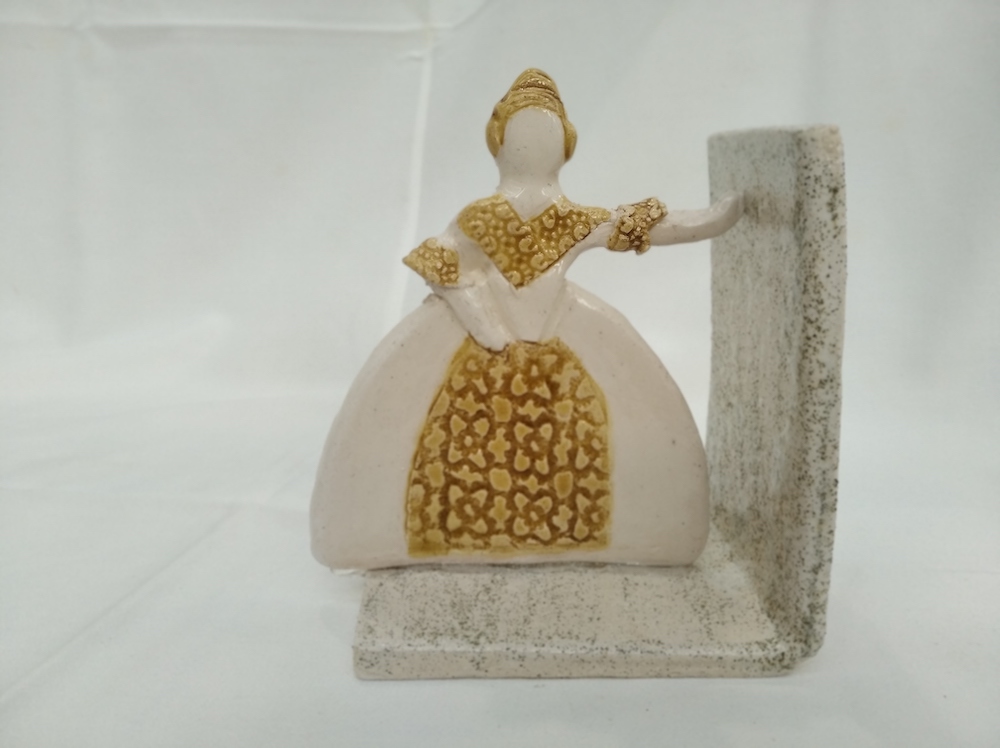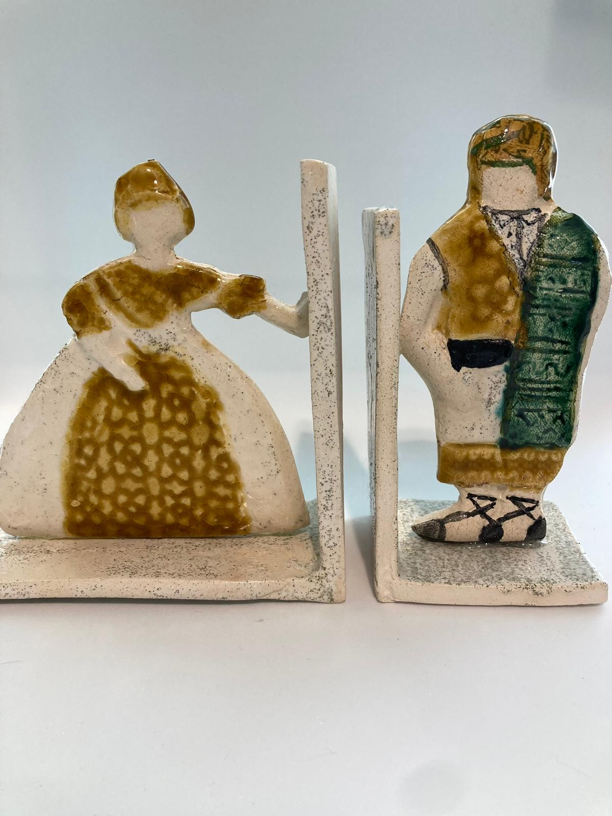 Sujetalibros de cerámica esmaltado con fallera y fallero.