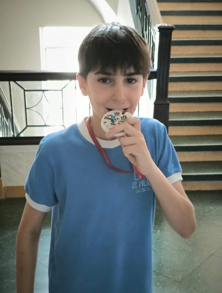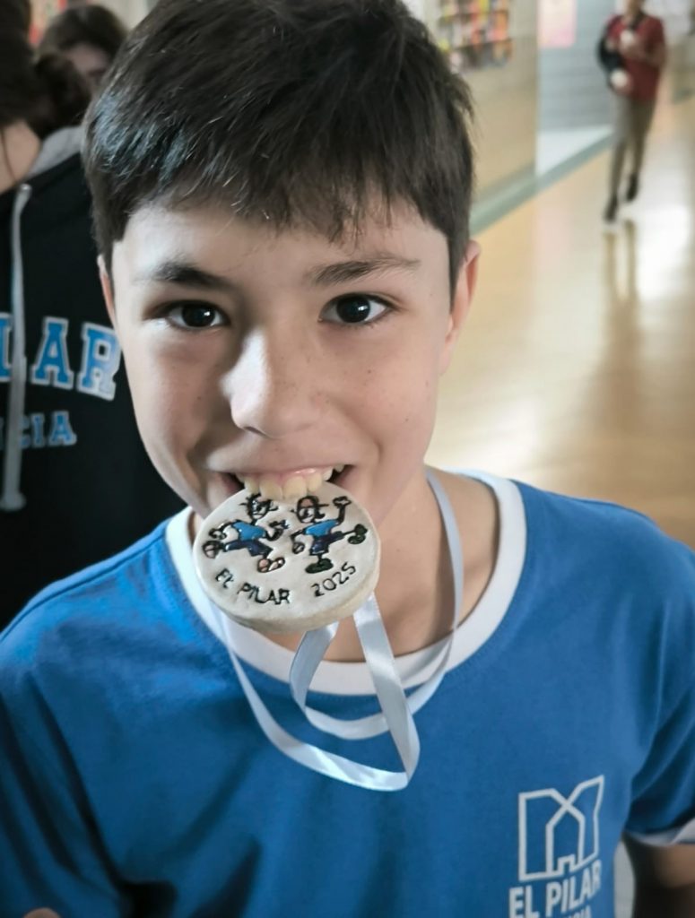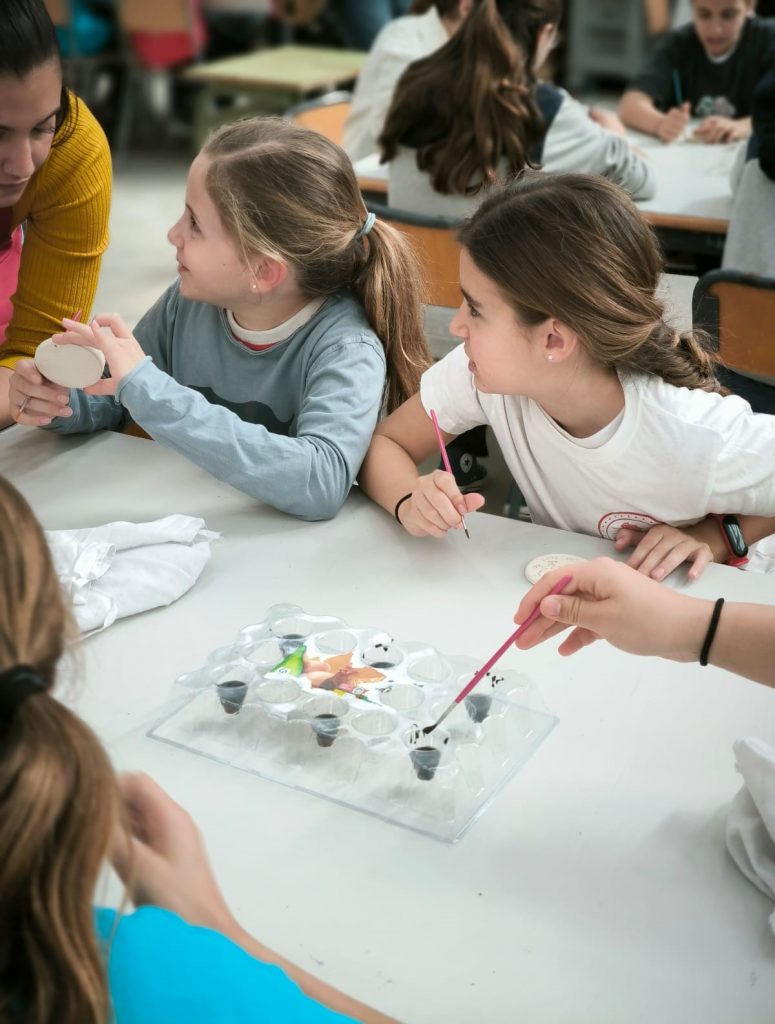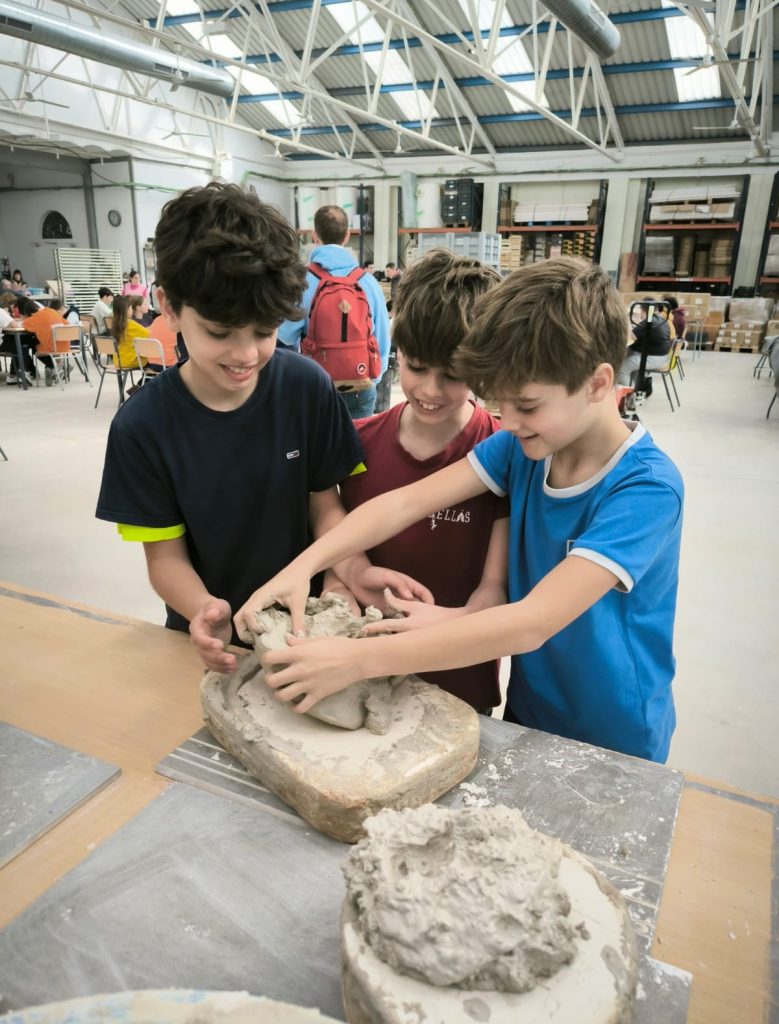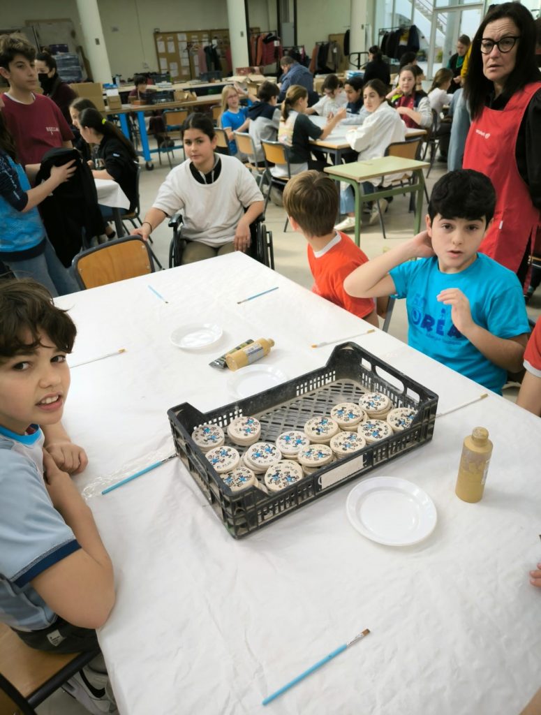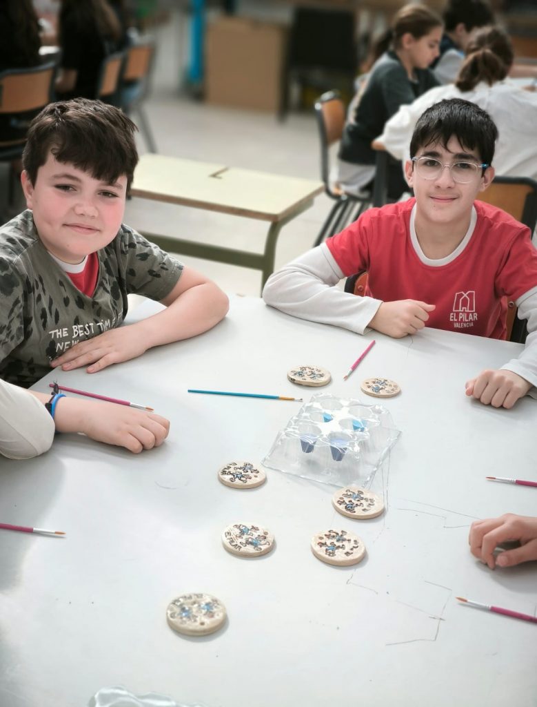 Nos enseñaron a hacer medallas, ¡sí, las medallas de las Olimpiadas Marianistas de Valencia! Primero desayunamos fuera y luego entramos al taller. Amasamos arcilla, la aplanamos con una máquina y después hicimos la forma de la medalla con un molde redondo. Encima pusimos un dibujo de dos muñecos vestidos con ropa de deporte.